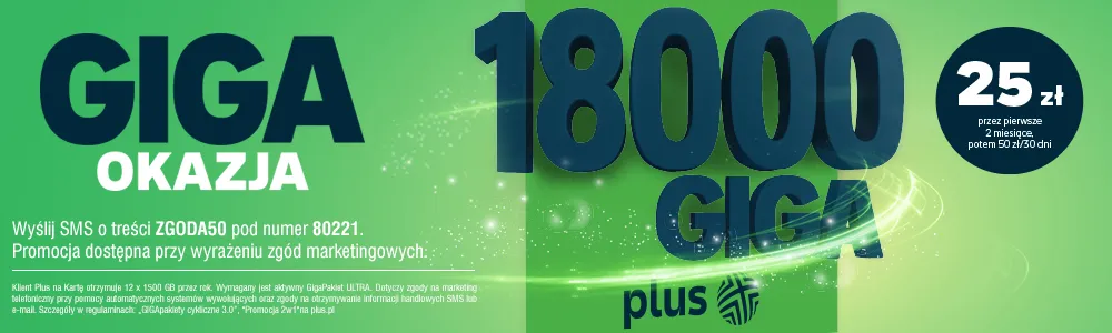 Szczegóły w regulaminach promocji „Nie płać za drugi miesiąc”, „GIGApakiety cykliczne 3.0” dostępnych na plus.pl.