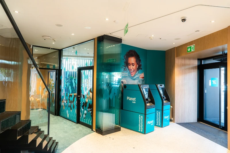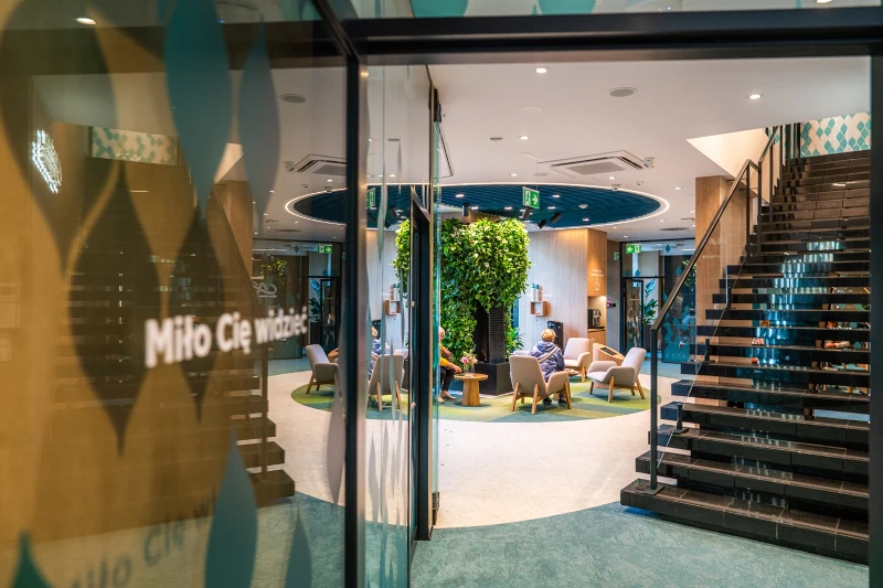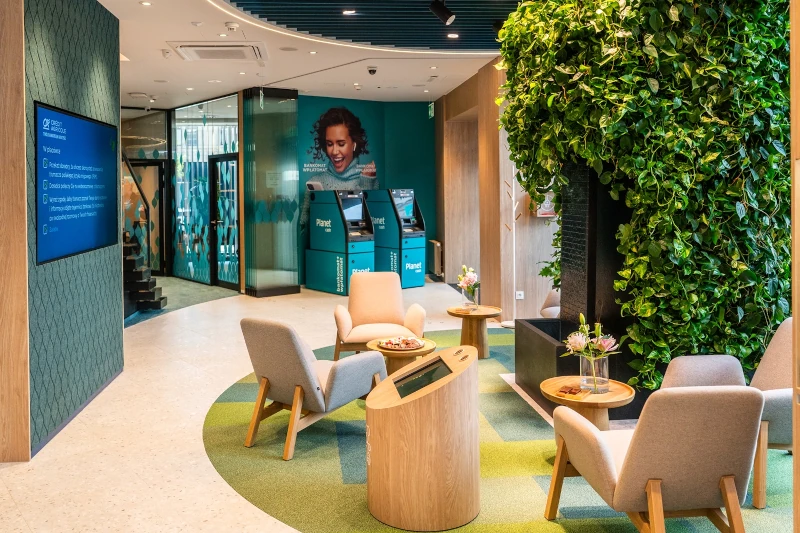 Sercem Centrum Doradczego jest tzw. epicentrum – przestrzeń, w której klienci mogą odpocząć, napić się kawy i przygotować do rozmowy z doradcą. To tutaj znajduje się wyjątkowa kaskada wodna wykonana z granitu, po której spływająca woda tworzy atmosferę spokoju i harmonii. Towarzyszy jej ogród wertykalny pełen zieleni, który wprowadza naturalny, kojący klimat. Dodatkowo placówka została zaprojektowana tak, aby każdy mógł korzystać z jej oferty bez barier. Jest w pełni dostępna architektonicznie, a dodatkowe rozwiązania, takie jak pętla indukcyjna czy asystenci głosowi w urządzeniach samoobsługowych, ułatwiają korzystanie z bankowości osobom ze szczególnymi potrzebami.