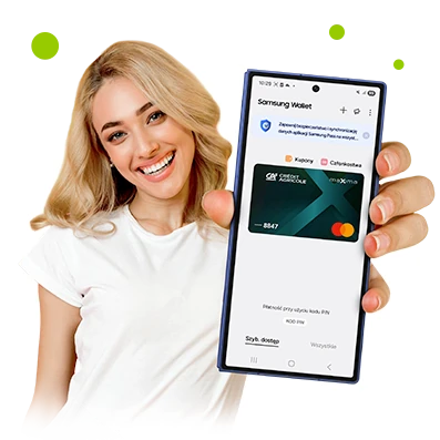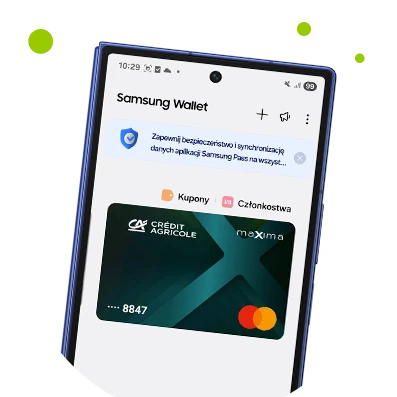 Samsung Pay jest dostępny dla kart wydanych przez bank zgodnie z Regulaminem korzystania z kart płatniczych Credit Agricole Bank Polska S.A. w ramach usługi Samsung Pay. Samsung Pay oraz logo Samsung są znakami towarowymi firmy Samsung Electronics Co Ltd.